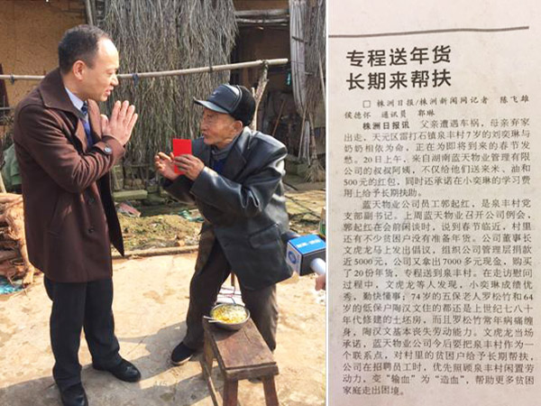 此次由藍天物業(yè)自發(fā)組織的扶貧慈善活動,共幫扶了泉豐村12戶困難家庭,公司員工捐款近5000元,總計募捐12000多元現(xiàn)金,購買了20份年貨物資送給各幫扶對象。董事長文虎龍先生表示,今年的慈善活動很有意義,此后公司要更多更大力度的進行類似慈善活動,讓獻愛心、常感恩的行動凝聚成為藍天物業(yè)以后企業(yè)文化的一項內(nèi)容,常以感恩回饋的善舉回報社會、溫暖人心。藍天物業(yè)的善舉也得到了有關媒體的報道,株洲晚報在1月21日報道了藍天物業(yè)的愛心事跡。