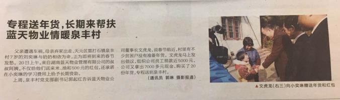 2017年1月20 日,在董事長文虎龍先生的號召帶領下,藍天物業(yè)全體員工積極響應號召,投身獻愛心公益事業(yè),帶著自行募捐的愛心物資慰問株洲市天元區(qū)雷打石鎮(zhèn)泉豐村的困難群眾。