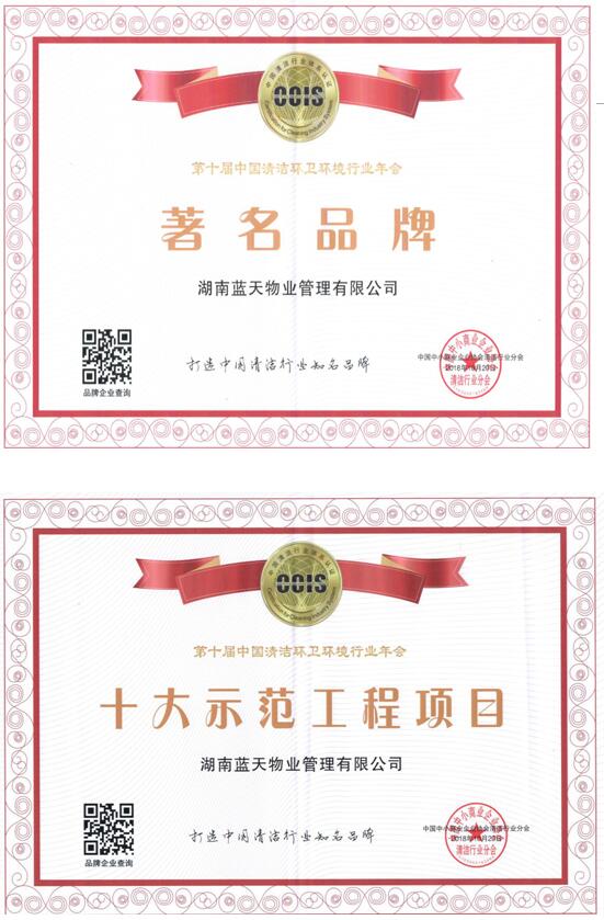 2018年10月,藍(lán)天物業(yè)在全國(guó)眾多企業(yè)激烈角逐中脫穎而出,成功入選第十屆中國(guó)清潔環(huán)衛(wèi)環(huán)境行業(yè)“著名品牌”及“十大示范工程項(xiàng)目”兩項(xiàng)榮譽(yù)。