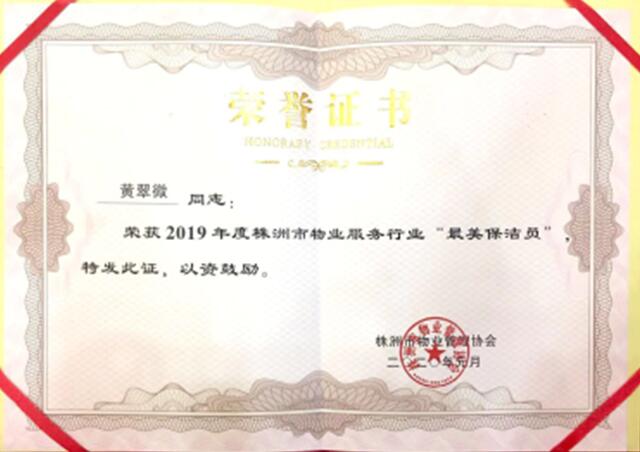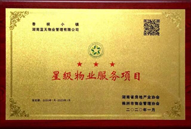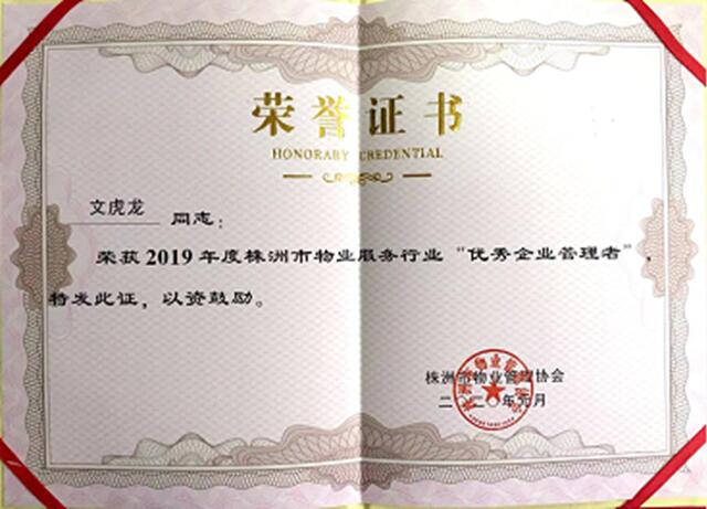 2020年1月15日,株洲市物業(yè)管理協(xié)會2019年年會在株洲市天臺山莊和諧廳舉行,會議上宣讀表彰了株洲市2019年度優(yōu)秀企業(yè)、2019年優(yōu)秀管理者、星級項目、最美物業(yè)人等獎項,我公司被株洲市物業(yè)協(xié)會授予“2019年度優(yōu)秀企業(yè)”、董事長文虎龍先生被授予“2019年度優(yōu)秀管理者”、公司服務項目香檳小鎮(zhèn)被授予“株洲市三星級物業(yè)服務項目”,公司員工黃翠微被授予“最美保潔員”等光榮稱號。