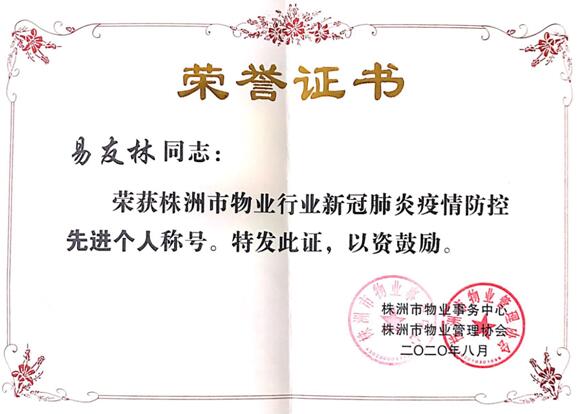 易友林同志為“2020年物業(yè)行業(yè)新冠肺炎疫情防控先進(jìn)個(gè)人”。